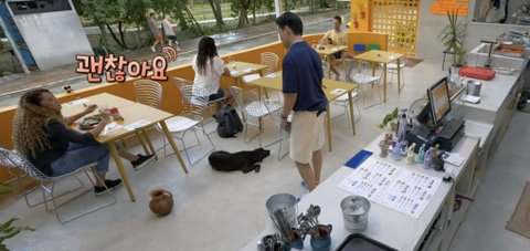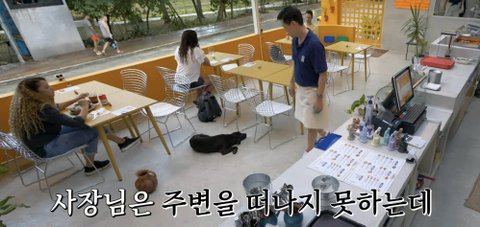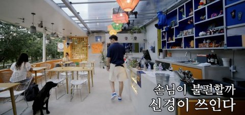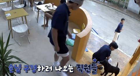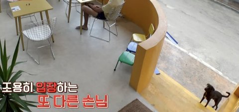 비가 내리자 강쥐랑 산책하던 한 손님이 뛰어들어옴