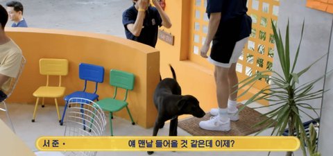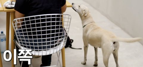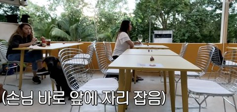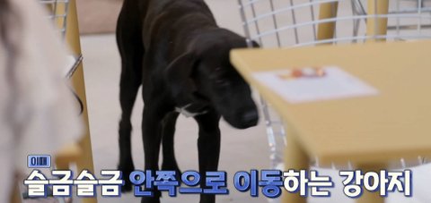 식사중인 손님 앞에 자리잡아버리는 강아지