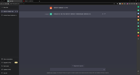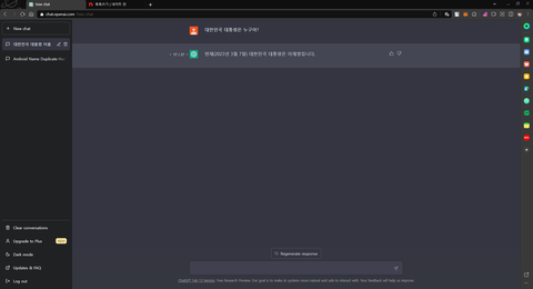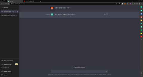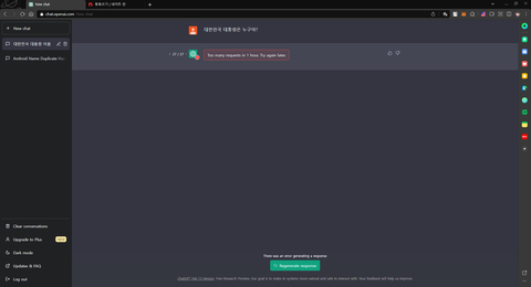Chat GPT가 그만하라고 메시지 띄울 때 까지 재응답 버튼 눌렀는데 27번 동안 단 한번도 굥산군 이름 나온적 없음 ㅋㅋㅋ