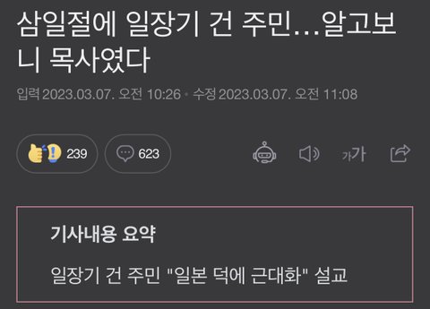 화가난다와 이사람 뭐죠...ㄷㄷㄷ 하루하루 뉴스거리 되는 것도 재주다 재주야 삼일절에 일장기 달았던 화제의 그 인물이 목사랍니다ㅋㅋㅋㅋ 근데 그냥 목사 아니고 친일하는 목사라고 해야될 듯ㅋㅋㅋ 설교 영상 보면 일본을 대일본제국이라고 칭하고, 그 덕분에 우리가 근대화 됐다고 말하고 심지어 자기가 일장기 게양한 일을 언급하면서 아파트에 태극기 게양한 곳이 거~~~의 없어서 자기 일장기가 더 돋보인 거라곸ㅋㅋㅋㅋ 태극기 안 건 주민들이 문제라고 했다네욬ㅋㅋㅋㅋㅋ 와 목사 아니고 코미디언 해야될 듯^^~!!!!