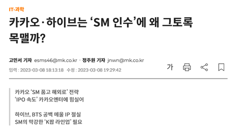 이런 상황에서 전통적으로 막강한 SM의 K팝 IP를 확보할 수 있다면 매출·영업이익 개선에 당장 도움이 될 수 있다. 해외 시장 분포로도 하이브는 BTS를 기반으로 미국·남미 등의 시장을 개척해온 반면 SM은 중국과 동남아 시장에서 오랫동안 기반을 쌓아왔기 때문에 사업적인 시너지 효과가 기대된단 것이 하이브의 장밋빛 전망이다.