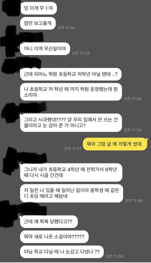 + 저와 동창들이 유일하게 기억하는 사건은 피해자라 주장하는 친구가 글에 쓴 학교 폭력 신고 사건입니다. 이 사건은 부모님이 서로 알아서 일단락 됐다기 보다는 애초에 학교 폭력 자체가 성립이 안 돼서 두 친구를 화해 시키고 사건이 종료된 것으로 알고 있습니다.