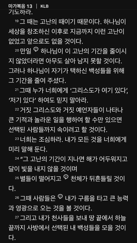 "그때 누가 너희에게 '그리스도가 여기 있다', '저기 있다'하여도 믿지 말아라. 거짓 그리스도와 거짓 예언자들이 나타나 큰 기적과 놀라운 일을 행하여 할 수만 있으면 선택된 사람들까지 속이려고 할 것이다. 너희는 조심하라. 내가 모든 것을 너희에게 미리 말해둔다."
