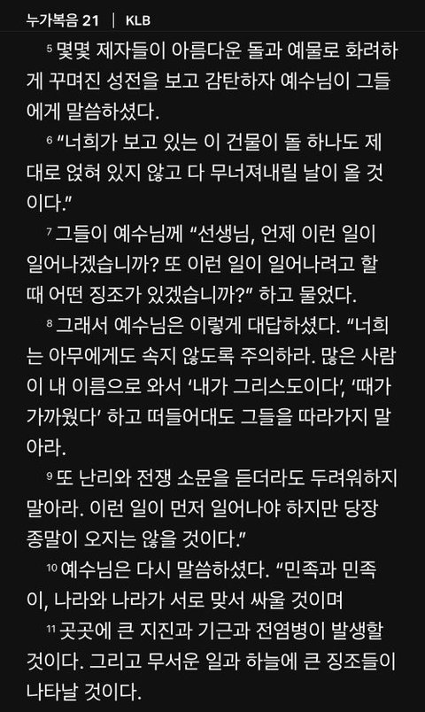 "너희는 아무에게도 속지 않도록 주의하라. 많은 사람이 내 이름으로 와서 '내가 그리스도이다', '때가 가까웠다'하고 떠들어대도 그들을 따라가지 말아라."