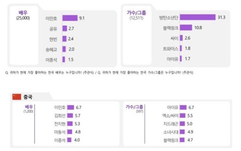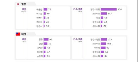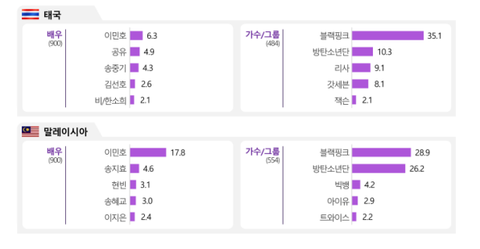 조사국가들 중국, 태국, 말레이시아 빼고 방탄 전부 1위