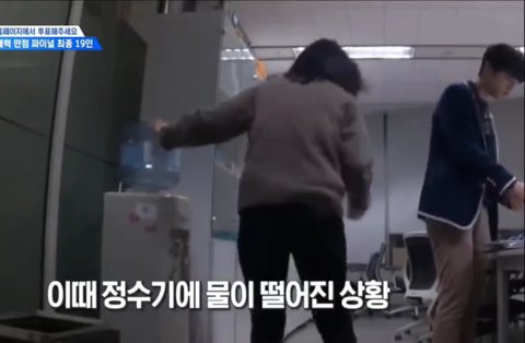 정수기에 물이 다 떨어져서 여작가님이 무거운 정수기 통을 들려고 하는 상황