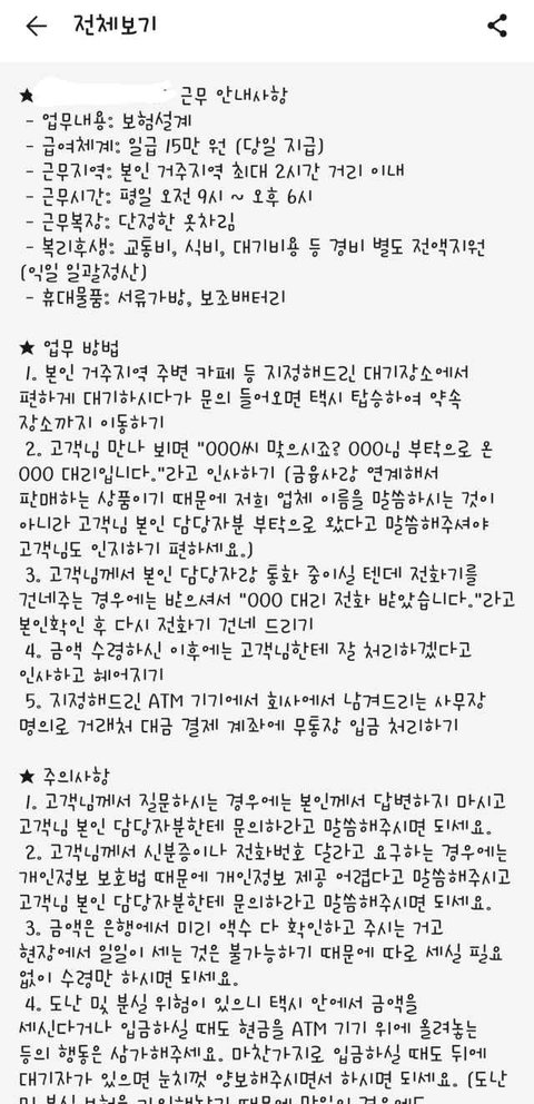 이거 모하는 회사임... 이게 9시에 나가서 카페에서 대기하다가 연락 오면 다른 지역가서 현금으로 막 2000만원 1000만원 받고 화장실 가서 백 만원으로 분리해가지고 모르는 사람들 개인정보 ex)김철수 700105016789 계좌번호 : 288383848 전화번호 : 01012345678 이렇게 명단을 한 20개를 줘 그럼 무통장 입금으로 최대 백 만원씩 입금할 수 있으니까 2000만원을 다 입금해 아니 ㅈㄴ 쎄해서.. 이게 무슨 회사지 뭐하는 곳이지
