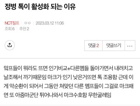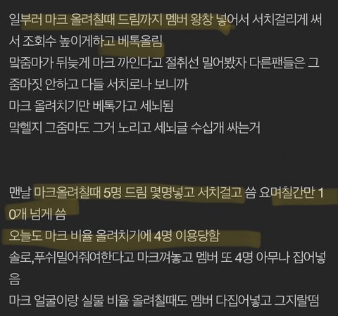 악개땜에 멤버 싫어진다는거 맠헬지땜에 이해함.. 이제 맠헬지랑 맠악개무리땜에 마크 얼굴만 봐도 토악질 날정도로 싫어짐 까글 먹금하고 정상화시키자하면- 마크빼고 견제되는 드림멤들/127멤들 깔 정신병분출장소 사라지니 반대/망하게하자하면 말로만 그러고 마크제외 타멤들 까글, 이런 후려치기 어그로글 서치넣고 베톡가게 계속 쓰고 마크만 올려침. 참다참다 타멤프가 맠프한테 까인 절반만 마크한테 돌려주면 고소 드립침. 오늘도 5시간 타멤들 까다 마크 10분 술로 까이니 고소, 절취선 그음. 맠프들아 너네땜에 앞으로 마크한테 안좋은일,건강에 불운한일만 생기길 기원할게 업보 받아