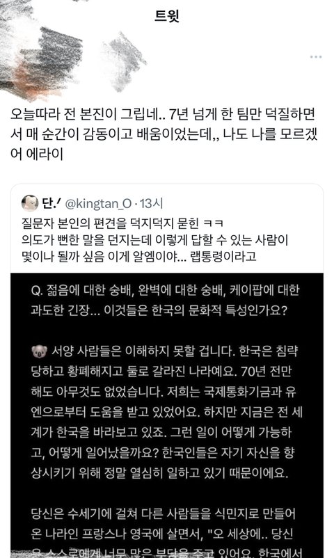 거의 뭐 전남친 수준으로 미련 남아보이는데 ㅋㅋㅋㅋㅋㅋㅋㅋㅋㅋㅋ진짜 저 모르겠다까지 미련이 너무 남아있어보임