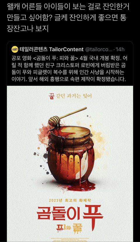 영화 곰돌이푸 호러 수지 아이유 김새론 더글로리 뉴진스 엔시티 투바투 방탄 블핑 제니 에스파 카리나 제노 마크 정국 해찬 민지 지민 해린 뷔 연준 홍은채 새학기 트와이스 나연 지수 빅뱅