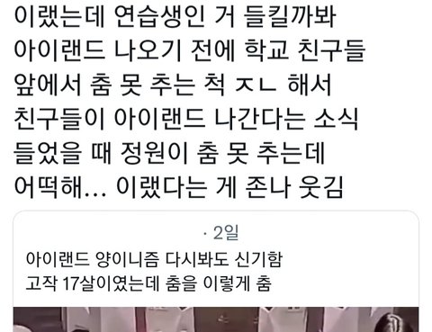 남돌 중에서도 춤 잘추는 편인데 댓글 추해서 짜증남 판하는 애들 얼마나 정신병 심한지 잘 알겠음 저 안무 시안 보면 양정원 저 춤을 살리네 소리 나옴https://youtube.com/shorts/BwNvLzITSKU?feature=share