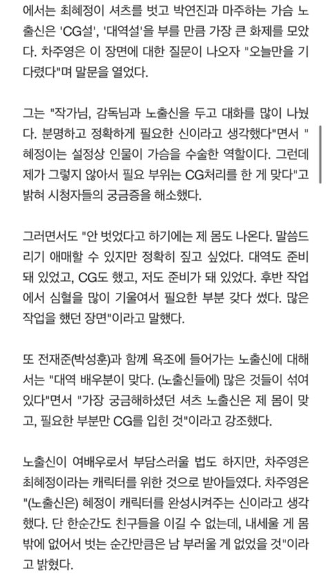 결국에 주장하는 것들도 애초에 그럴 것이다~ 이럴 것이다~라는 카더라 말고는 없었음. 의상도 배우 본인 피셜로 혜정역을 위해 찌운 살이 보기 흉하게 드러날까 걱정했다가 끝인데 뒷말 다 자르고 의상의 협의하지 않았다만 치우쳐져서 난리치고 목욕신이나 셔츠 장면도 대역에 CG라니까 합의된 내용이 아니라며 왜 유독 혜정만 성상품화 하냐 언제까지 이런 걸 배우들이 참아야 하냐면서 온갖 비난하고 감정호소만 하다 배우 본인피셜은 관심도 없는거 보면 그냥 이때싶 남녀갈등으로 끌고 싶었던거 같음. 왜 넷플이나 다른 청불 작품들은 불편함 없이 잘만 보다 이런 말이 나왔는지 모를 일...ㅎㅎ 이 일로 또 남초에서는 역시 예쁘니 마인드도 다르다며 배우 찬양하고 여자들 싸잡아 한녀들 능지 ㅇㅈㄹ 떨거 생각하니까 벌써부터 아찔...