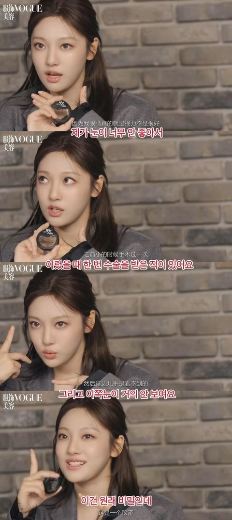 보그 인터뷰에서 밝힌 건데 눈이 많이 안 좋고 오른쪽 눈은 거의 보이지 않는 상태래 그래서 맨날 선글라스 끼고 플래시가 무섭다고 했었던 거였음 넘 맘 아파..