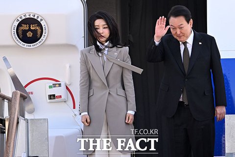 한일 정상회담에 나서는 윤석열 대통령과 김건희 여사가 16일 오전 경기도 성남시 서울공항에서 인사를 하고 있다.