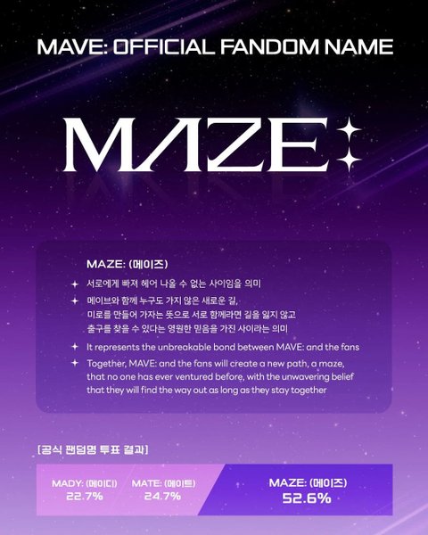 MAVE: - MAZE:(메이즈)누구도 가지 않은 새로운 길, 미로를 만들어 가자는 뜻으로서로 함께라면 길을 잃지 않고 출구를 찾을 수 있다는 영원한 믿음을 가진 사이