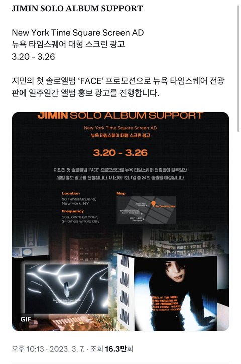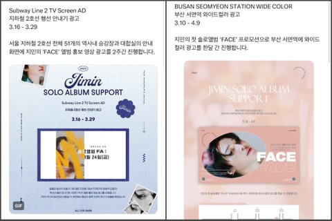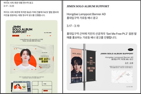 방탄 지민 10년만에 나오는 첫 솔로라고 팬베에서 서폿 역대급으로 크게 하는거 같음