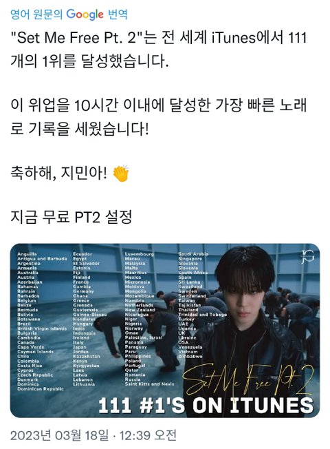 지민 2시간 반만에 아이튠즈 80개국 1위