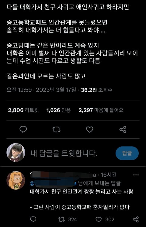 ㅇㅇ맞말임 대학이 고딩때마냥 수업 끝나고 쉬는시간에 떠들고 체육시간에 게임하고 야자하고 그런게 없잖아 근데 고딩때 친구 조금이라도 있었으면 오티 새터 개총 엠티 동아리 이런거 가면 친구 못 사귈 일은 없음