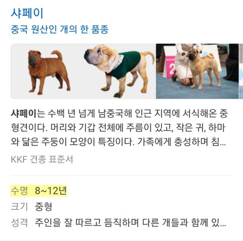 그리고 샤페이는 평균수명이 8~12년으로 중형견중에서도 짧음