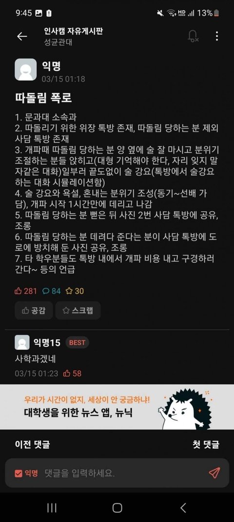 나 저 학교 저 과 1n학번인데 저 과는 예전부터 쭉 그랬음 단톡까지 만들고 안했을뿐이지 고인물들끼리만 친하게 지내면서 다른 애들은 배척 ㅈㄴ 함 그리고 선배랑 친해져야지만 그 고인물 무리에 들어갈 수 있음ㅋㅋㅋ..