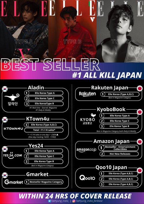 방탄소년단(BTS) 뷔가 커버를 장식한 패션 매거진이 국내외에서 '올킬 1위'를 기록하며 서점가를 강타했다.
