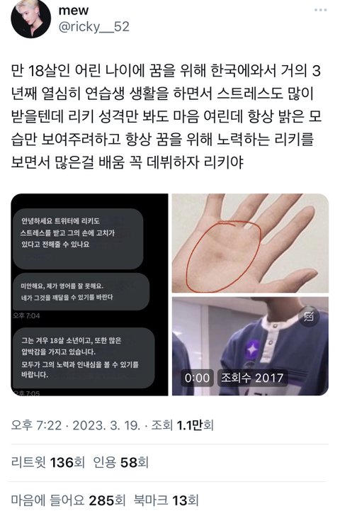 물론 열심히하고 아이돌에 진심인 건 알았음 근데 에티튜드도 항상 여유롭고 상남자같이 덤덤해서 이렇게 진심일줄 ㅠㅠ 리키앰 맘 찢어짐 순딩아ㅠㅠ.ㅠㅠㅠ… 두번째 동영상에서 상처 만지고 있는데 맘 아픔 진짜 데뷔했음 좋겠다ㅠㅠ