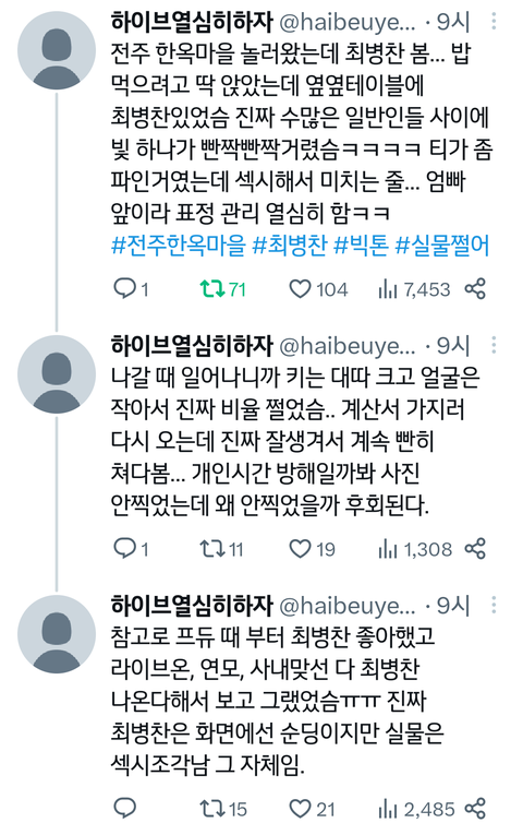 나도 최병찬 길에서 본 적 있는데 실물 미쳤음 동생이 팬이라 인사 했는데 사진도 찍어주고 진짜 친절해서 더 호감