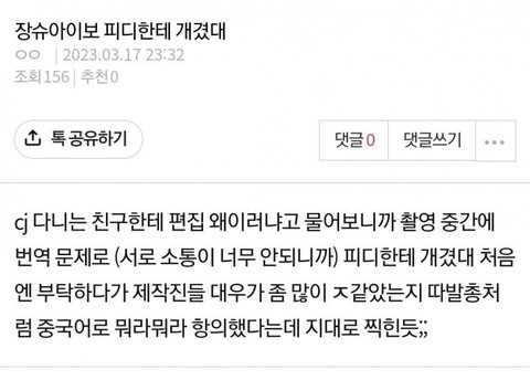 그래서 장슈아이보가 피디한테 거의 개기는 수준으로 항의했고 피디는 자기한테 개기니까 개빡쳐서 장슈아이보 의도적으로 악편함 걍 찍힌듯