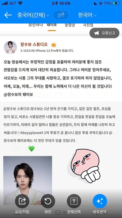 +장슈아이보 소속사에서 글 올라왓던데 부정적인 감정 표출해서 미안하다고 하는 거 ㄹㅇ 자기는 걍 열심히 항의햇을 뿐인데 악편 씨게 당하고도 미안하다고 하는 거잖… 걍 안쓰러움