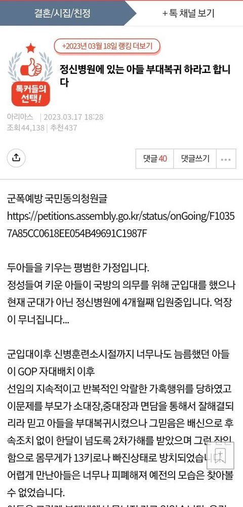 그런데 전역 후에도 민사소송까지 하며 책임을 묻겠다는 문자를 보내며 인터넷에 글을 쓰고 국민청원까지 올려버리니 도저히 저희도 그냥 지켜만 볼수는 없어서 이렇게 길게 글을 쓰게 되었습니다.