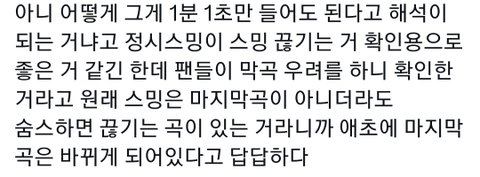 의견을 표출하는걸 넘어서 음모론 만들면서 누구악개니 누구를 배척하니 이러는 사람은 개줌들밖에 없으니까 줌혐만 오지게 생김 정중하게 의견을 내는것도 아니고 줌내가 ㅈㄴ 나는데 음정팀이 신경이나 쓰겠냐고 막말로 음정팀이 진짜 한멤버를 배척하고 스밍에 반영 안되게하려고 그랬겠냐 다 정보알려주려고 1분 1초 넘기만해도 반영된다는걸 알려줬겠지