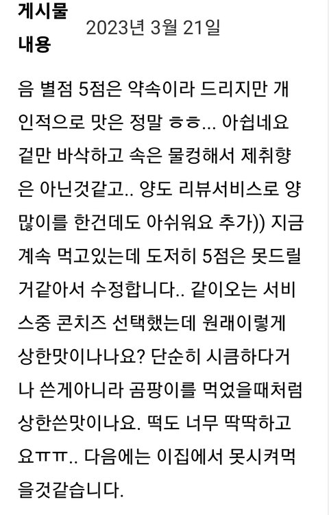 5점 줬던거 2점인가 3점으로 수정하고 저얘기썼는데 리뷰 답변 하나없이 임시차단을 먹이셨네ㅎㅎ..