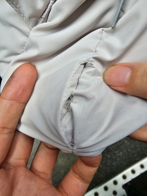옷을 벗어서 꼼꼼히 살펴보니 왼쪽 옆 하단에 박음질 불량으로 내장재가 나온것을 확인했습니다.