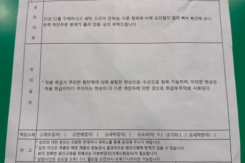 상담내용 : 22년 11월 구매하시고 세탁, 드라이 안하심. 다른 점퍼에 비해 오리털이 많이 빠져 확인해 보니