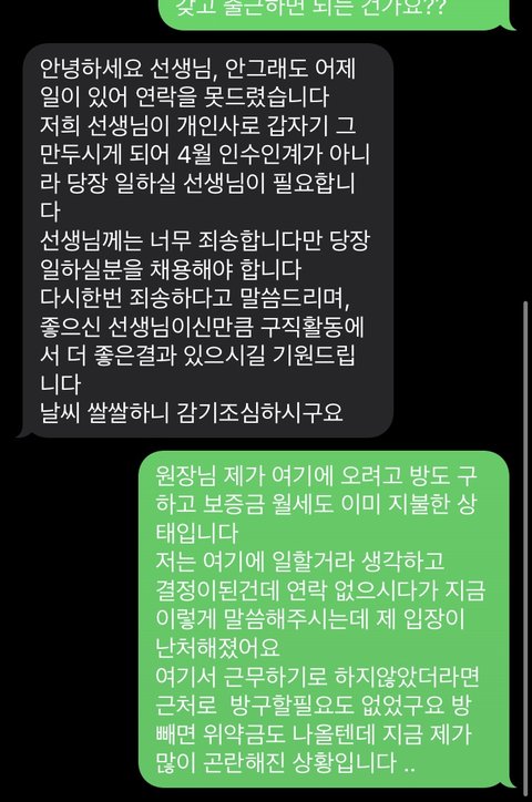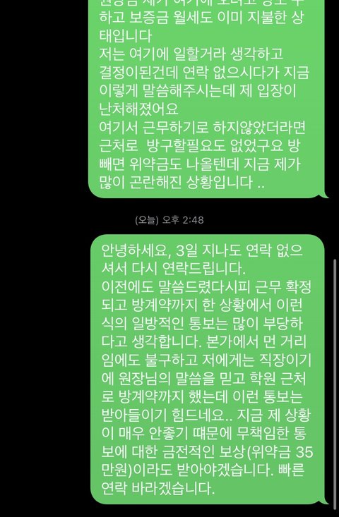 안녕하세요. E*e고*대어학원*전*동캠퍼스 원장을 고발합니다. 저는 지금 천안에 거주하고 있고 다른 회사에 재직중입니다. 지금 집주인이 월세와 보증금을 올려서 다른 곳으로 이사를 해야하는 상황에서 일자리 먼저 찾고 근처에 방을 구하자는 마음으로 먼저 구직사이트에 이력서를 넣고 면접을 보러다녔습니다. 그러던중 3월 9일에 e*e고*대어학원 *전*동점에 면접을 보러 갔습니다. 제가 지금은 천안에 거주하고있으며, 재직중이라 4월부터 입사할 수 있다고 말씀드렸고, 방은 입사할 곳 근처로 잡을 거라 아직 안 구했다고 말씀드렸음에도 불구하고 면접본 당일에 4월3일부터 출근하라고 말씀하셔서 구두로 계약을 했습니다. 그다음부터 저는 그 근처에 방을 알아보고 계약까지 완료한 상태입니다. 그런데 3월17일에 입사할 때 필요한 서류 문제로 연락을 드렸는데 연락을 안 받으시다가 3월18일에 다시 연락을 하니 그제서야 저한테 미안한데 사정이 생겨 4월부터가 아니라 지금 당장 일할 사람을 구해야한다고 통보식으로 문자를 보냈습니다. 그래서 제가 지금 처한 상황에 대해 말씀드렸지만 아무런 답도 안 와서 한번 더 연락드렸지만 계속 답장이 안 와서 전화까지 드렸지만 중간에 거절... 정말 억울합니다. 그곳에 입사예정이 아니었다면 그 근처에 방도 계약하지 않았을 겁니다. 금전적인 피해도 적지 않고 마음의 상처도 너무 깊네요. 이곳에라도 하소연하고 싶어서 글을 올립니다..