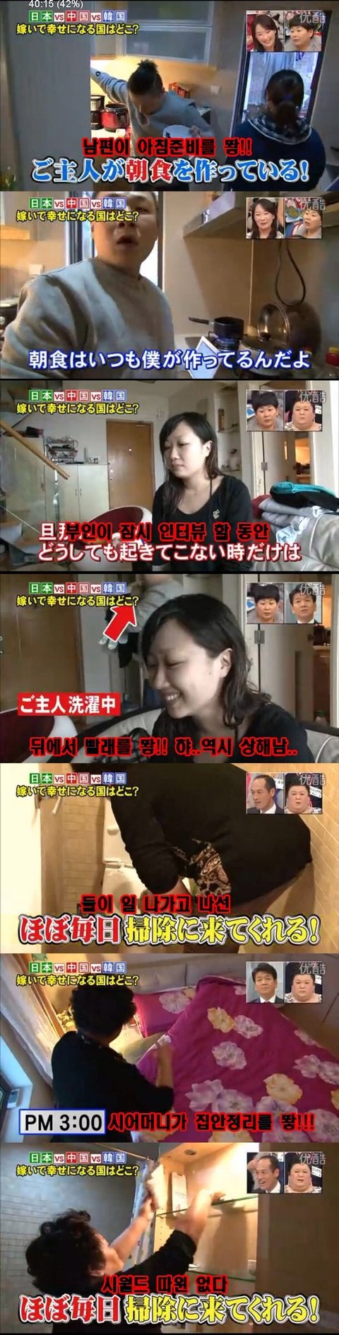 일본에서는 전업주부라고 기생충취급하지도 않고, 전업주부들이 당당함. 프로포즈할때도 당연히 남자가 침실3개 주방1거실1 집해와야 하고 다이아 반지 요구함. (보통 직장인 기준으로 말하는 거.) 우리나라에서 여자가 저래봐라 기생충 된장녀 소리 듣지 ㅋㅋ 우리나라는 여자가 애낳고 키우고 가사일해도 기생충, 남편 등골 빼먹고 남자는 불쌍해 퐁퐁남 이러면서 여자 노동은 꽁으로 생각하는데 스시녀들 안 그럼. 스시남들도 안 그럼. 한남들 스시녀에 환상품을때마다 웃김ㅋㅋㅋㅋ 그리고 일본이 시월드 한국보다 적은 건 사실임 가부장적인 문화도 있긴하지만 우리나라처럼 극심한 아들 선호사상까지는 아님. 여아만 집중낙태하던 것도 한국에서나 있던 사회적 현상이지 ㅋㅋ