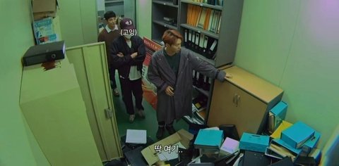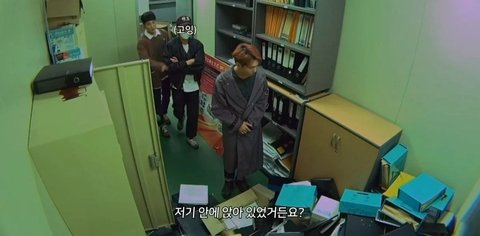 오른쪽 낮은 사물함에 앉아있었고 사람의 형체를 분명히 봤다는 원우.
