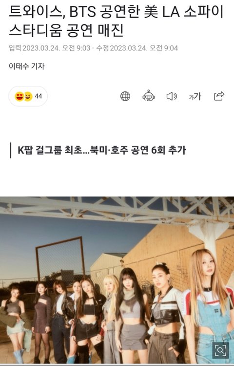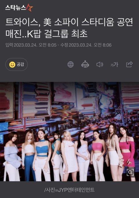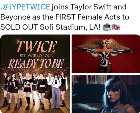 아니...트와이스 소피 스타디움 매진 이게..얼마나 대단한건지 가늠안가시는분들을 위해.. 일단 그 유명한 슈퍼볼하프타임쇼가 열리는곳이고 당연히 케이팝 걸그룹 최초 매진은 물론 심지어 전세계 여성 아티스트중에 매진기록 쓴 가수는 테일러스위프트 비욘세 그리고 트와이스...