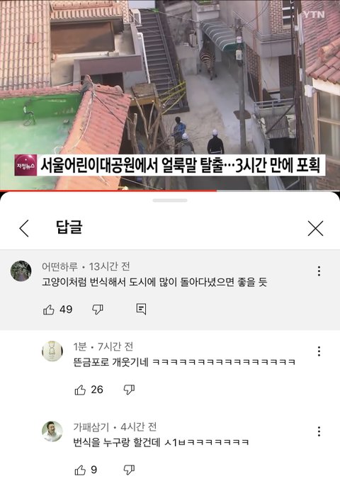 얼룩말 뉴스영상 댓글 뻘하게터짐