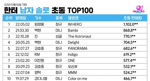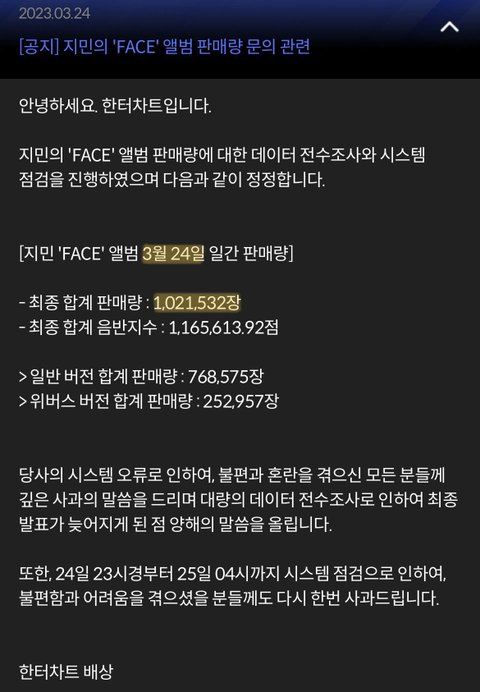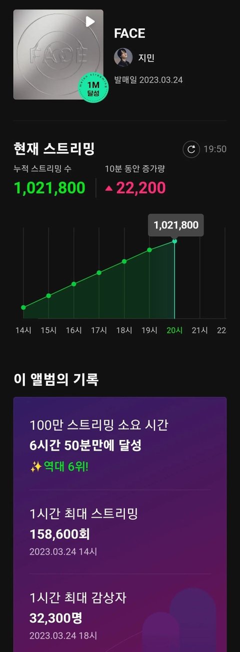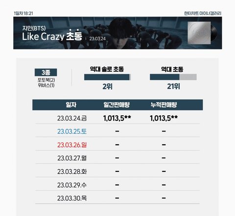 기존 첫날 1위 기록은 94만장이고 초동 일주일 기록도 119만장으로 같은 가수가 1위인데 지민이 1일차 102만이면 앞으로 남은 6일동안 솔로 초동 1위 기록도 세울수 있을듯ㅊㅋㅊㅋ