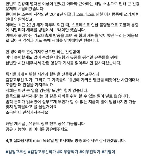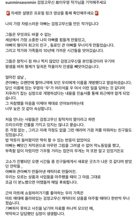 검정고무신 故이우영 작가님 자녀분 글 올리심!!!!!