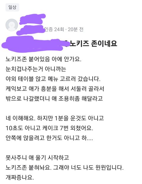 카페 합니다. 저도 아이 둘 키우는 입장이고요. 저걸 노키즈존이라고 하시면 곤란합니다. 아이랑 들어오자마자 사장님 혹은 알바가 나가달라고 한게 아니잖아요. 아이가 흥분을 했고 케이크를 7번 외쳤다고 하셨죠. 아이가 흥분했으니 쫑알쫑알 병아리처럼 작고 귀엽게 말하지는 않았을겁니다. 앞서 말했듯 저도 아이 키워서 알지만 쉽게 흥분하는 아이들은 원하는게 바로 주어지지 않으면 점점 돌고래소리를 내죠. 케익이 준비되어 나가는 시간동안 계속 흥분이 고조될게 뻔하니 아이 좀 조용히시켜달라고 부탁한걸거예요. 주변에 다른 손님들도 계시는 상황이었을테니 부탁드린걸텐데 그게 불쾌한 부탁인가요? 저도 부모된 입장이라 내 아이 이쁘고 귀합니다. 떼써도 울어도 제 눈엔 예쁩니다만, 그렇다고 해서 다른 사람들에게, 다른 이의 영업장에 피해를 주는게 정당화될 수는 없다는것도 알기에 늘 주의하고 잘 훈육합니다. 각박하다고 생각하실수도 있겠지만 시대가 변했어요. 동네 수퍼 아줌마가 내 이름 알던 시절 생각하시면서 모든 이가 아이라는 이유로 모든걸 양해해주길 바라시면 안 됩니다. 양육 매너는 이제 쌍방이에요. 내가 최대한 피해 안 주려고 애쓰고 기본적인 예의를 차리면 또 그만큼 주변 분들의 양해와 친절로 돌아옵니다. 이런 글은 카페 사장 입장에서 읽어도, 부모 입장에서 읽어도 그저 피로하네요.