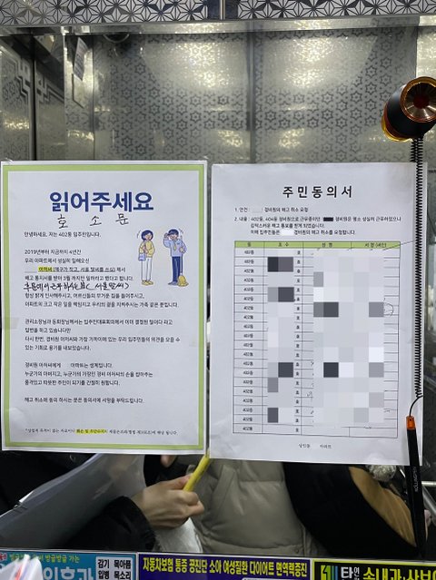 3/23 (목) 20시 대자보와 주민 서명 동의서를 엘베에 붙였습니다