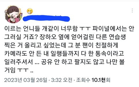 근데 그런 모습 가식이라도 안 보여주면 처 맞는게 아이돌임 어차피 유사는 자기 만족이지 진지하게 받아들이는 팬 있음?