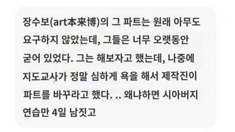위에 사진들은 장하오랑 올리, 하루토 순위 맞춘 관계자가 푼 썰이야 번역이라 잘 이해가 안 갈 수 있는데 대충 말하자면 아무도 메보를 하지 않아서 연습을 진행할 수 없는 상황 -> 결굳 장슈아이보가 떠맡게됨 -> 마스터의 혹평 -> 제작진이 파트를 바꾸라고 강요해서 어쩔 수 없이 파트를 교체 -> 그걸 의욕 없고 책임감 없는 아이로 편집