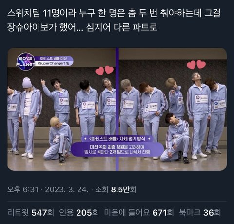엠넷이 장슈아이보를 의욕 없고 무능한 연습생으로 만들어놨는데 그게 아니야 ㅜㅜ 연습도 엄청 열심히하고 다른 파트에 서서 안무를 소화할 만큼 열심히 하는 친구야 어제 방청 후기를 보면 여론을 알고 있는지 상당히 기 죽어있는 모습에 멤버들 뒤에 숨어있었대 심지어 무대 끝나고는 울었다고 했어 원래 엄청 활발한 친군데 자존감 떨어진 모습 보니까 속상하다 이 모든게 이제 22살이된 사회초년생을 밑바닥으로 끌어 내리려는 엠넷의 악편이었다는걸 꼭 알아줬으면 해