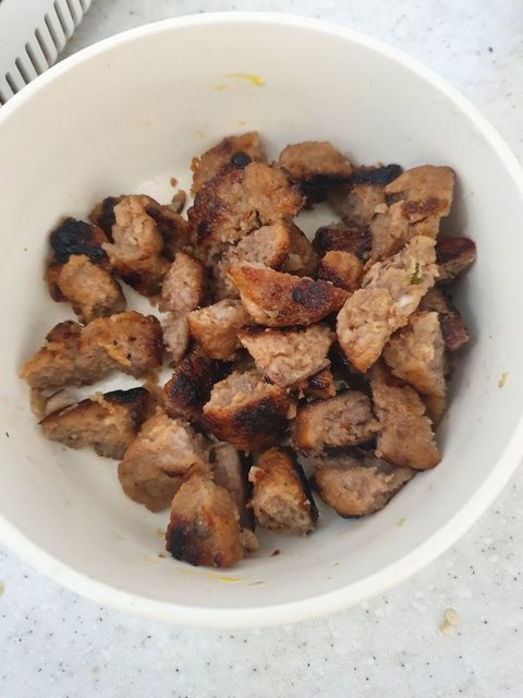 구워진 떡갈비 가위로 잘라서 담아주고(만두도 숟가락이나 가위로 잘라주세요.)
