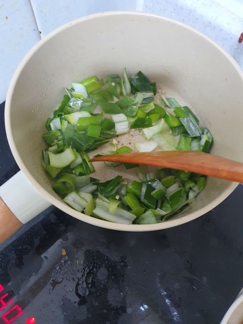 다시 식용유 두르고 파 고추 썰은걸 넣고 볶볶!