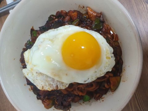 후딱 계란후라이 반숙으로 구워서 올려 먹었어요.