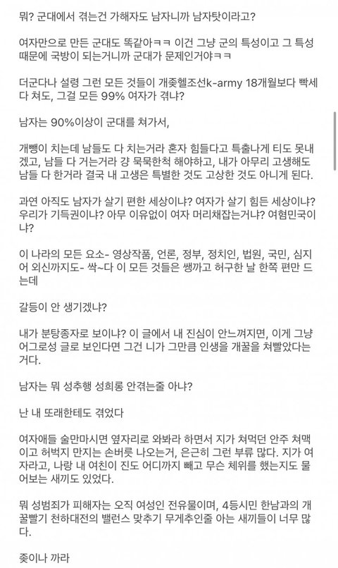 군ㄷㅐ 1년6개월 다녀오면 평생 모든 성범죄해방, 남자와 동일 임금보장, 유리천장 철퇴, 출산해방이 보장되면 난 두번이라도 갈 수있음.